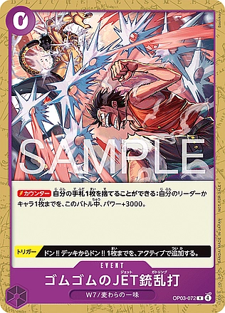 The OPTCG OP03-072 0c Purple Gum-Gum Jet Gatling Event card with English card effect.