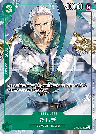 The OPTCG OP10-032 3c Green Tashigi Character card with English card effect.