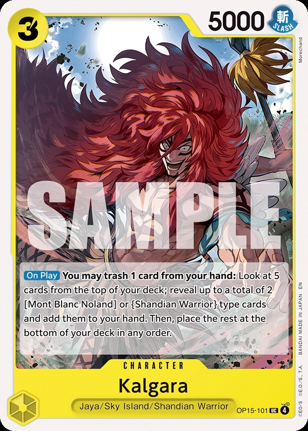 Top placing OP15 Yellow Kalgara OP08-098 decklist featuring Sky Island, Shandian Warrior and Jaya type cards.